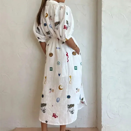 Female Casual Vacation Dress Women Chic Graffiti Print Lace Up Midi Dress Elegant Lapel Lantern Short Sleeve Dresses for Autumn