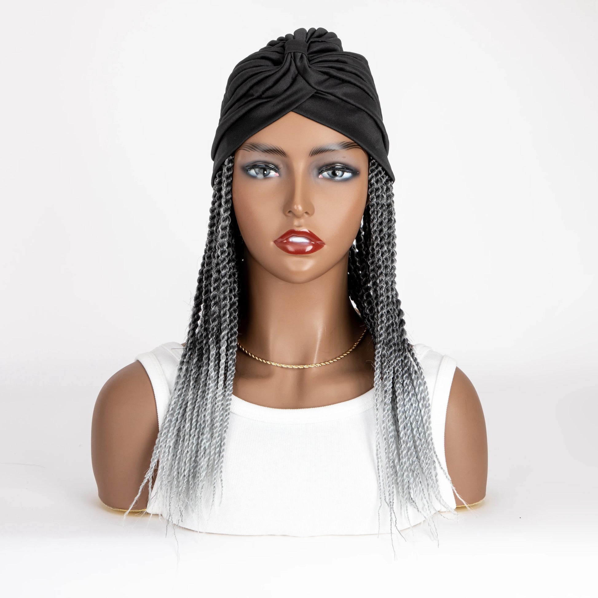 WIGERA Medium Ombre Black Gray Headband Twist Braided Synthetic Wig With Turban Braiding Hair Extensions Head Scarf For Women