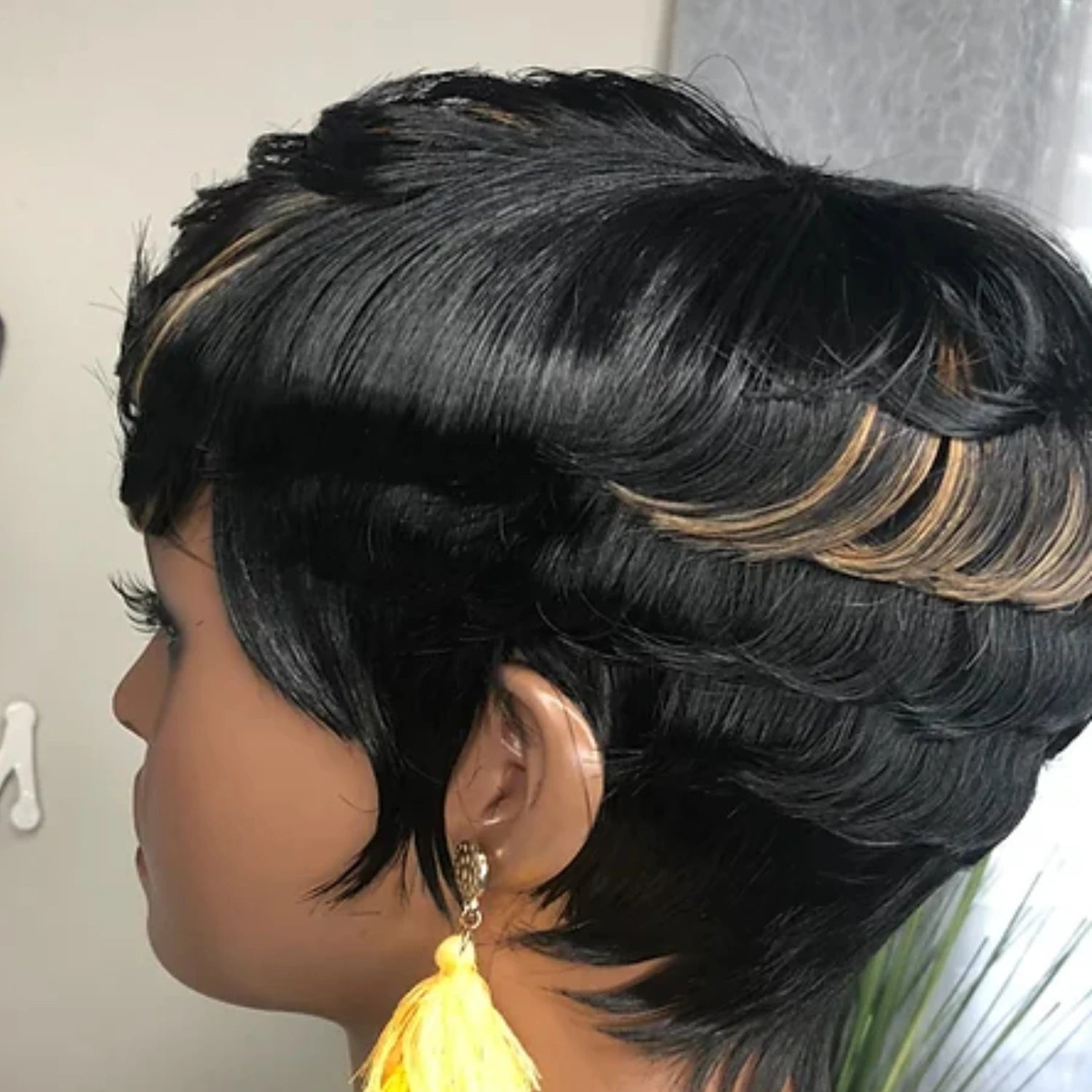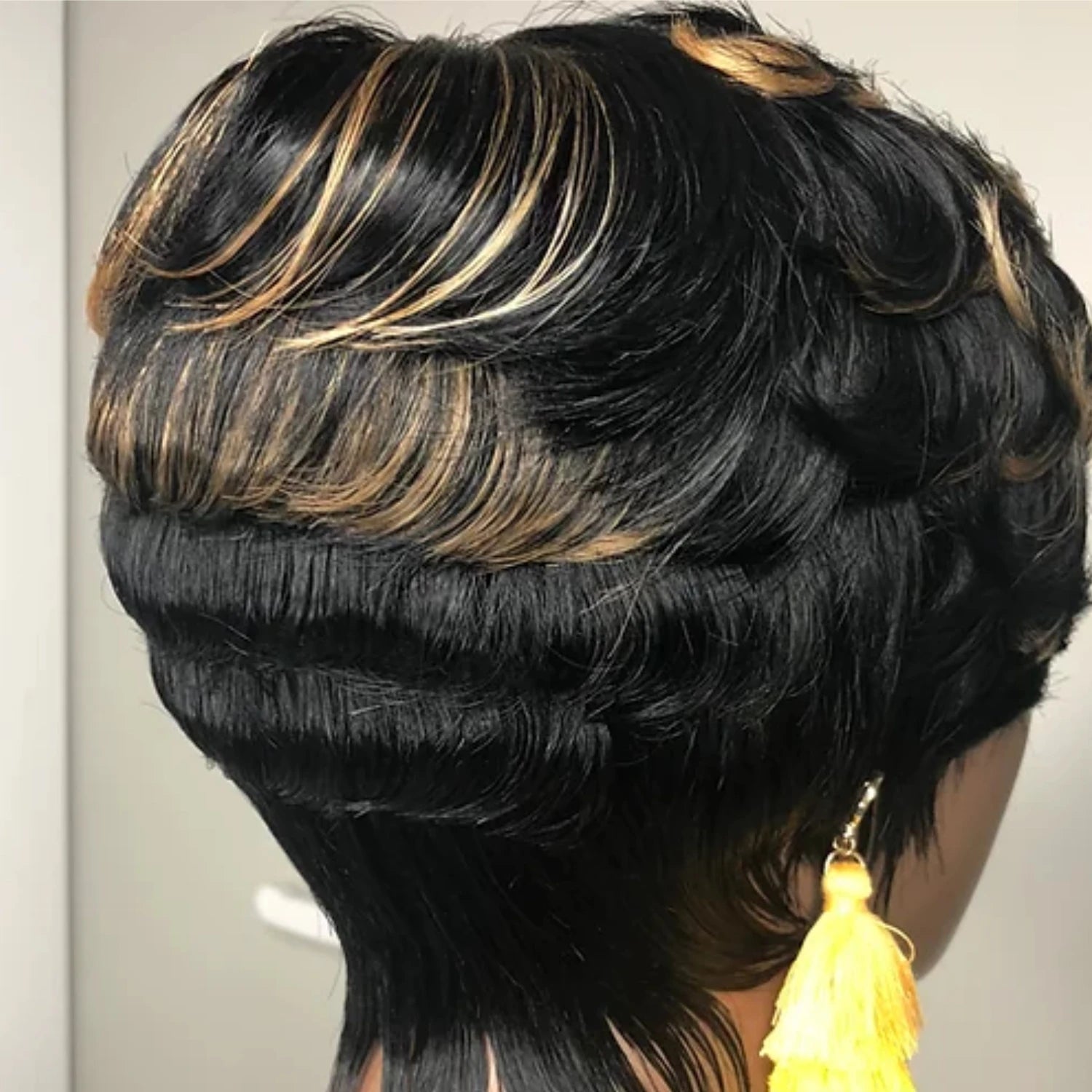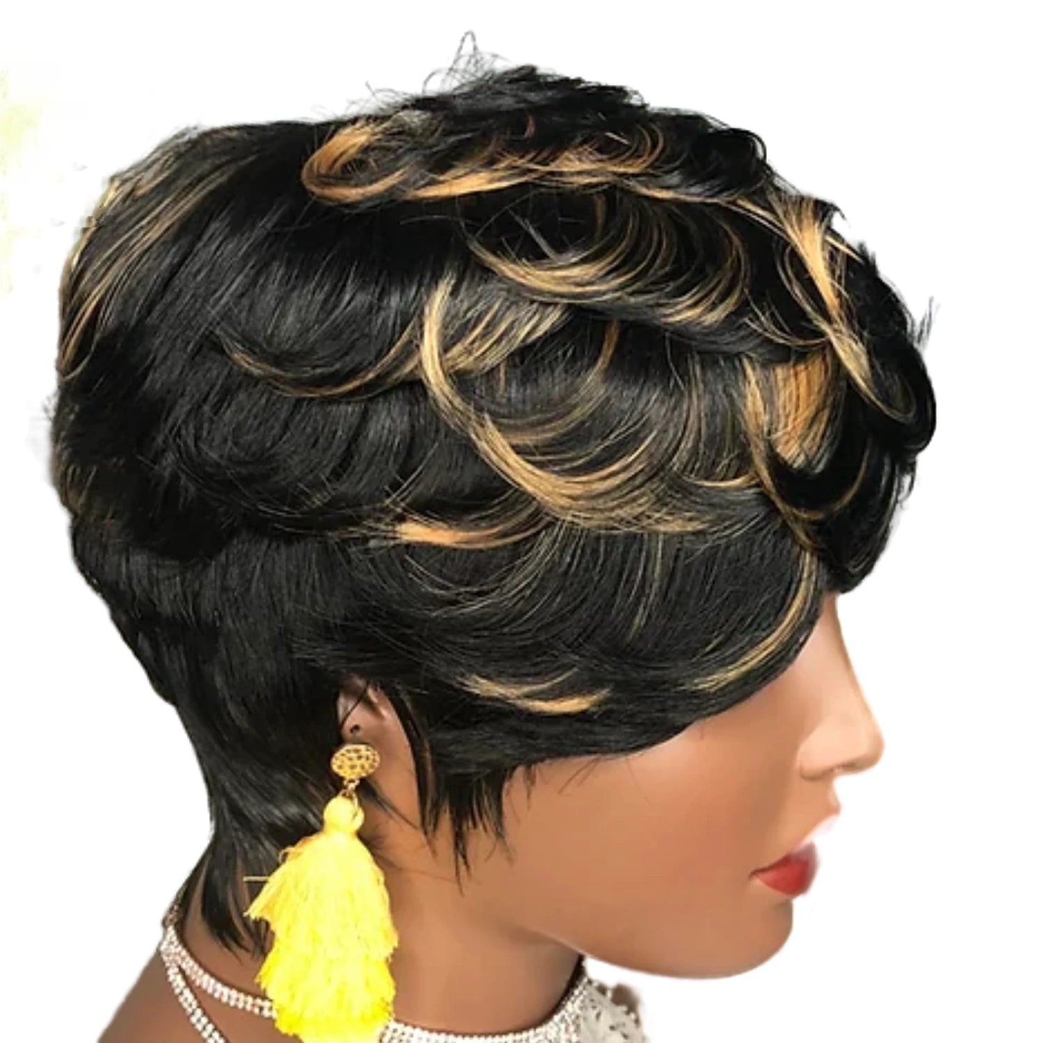 WIGERA Synthetic Highlight Cheap Ombre Black Blond Gold Short Straight Pixie Cut Hair Bob Wig With Curly Bangs Hair For Women