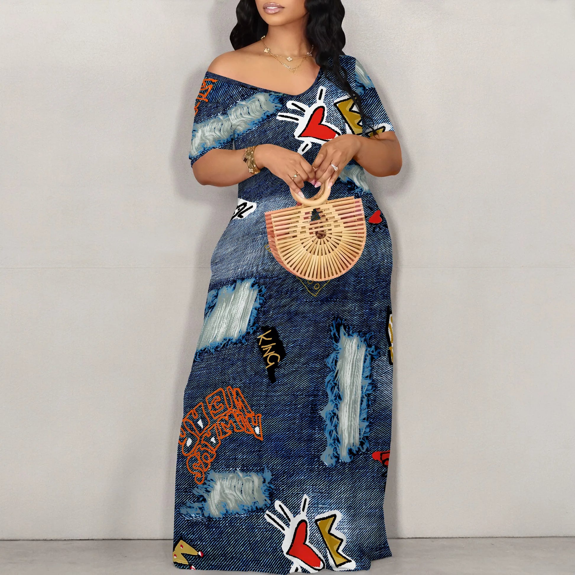 Women's Fashion Printed Short Sleeve Long Summer Dress Sexy Off Shoulder Backless